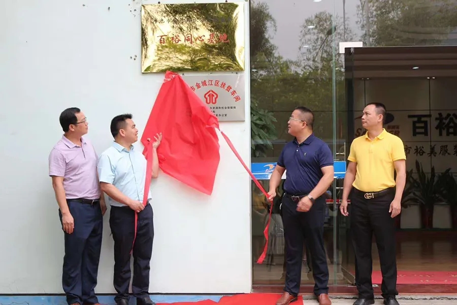 百裕集團(tuán)河池分公司是河池市委市政府招商引資的服裝生產(chǎn)企業(yè),也是金城江區(qū)重點(diǎn)企業(yè),主營(yíng)服裝生產(chǎn)加工業(yè)務(wù),公司現(xiàn)有員工149人,其中,來自貧困家庭員工8人。2020年疫情期間,已落實(shí)發(fā)放公司國(guó)家階段性減免企業(yè)職工基本養(yǎng)老、工傷、失業(yè)三項(xiàng)社會(huì)保險(xiǎn)單位部分補(bǔ)貼13.83萬元和企業(yè)一次性防疫補(bǔ)貼1.2萬元。此前,公司已經(jīng)區(qū)人社部門認(rèn)定為金城江區(qū)就業(yè)扶貧車間。今年的就業(yè)扶貧車間吸納貧困勞動(dòng)力獎(jiǎng)補(bǔ)標(biāo)準(zhǔn)已提高至2000元/人。按照自治區(qū)文件要求,對(duì)就業(yè)扶貧車間需授予牌匾。因此,公司舉行簡(jiǎn)樸的揭牌儀式,蘭軍城局長(zhǎng)親自為扶貧車間牌匾揭牌。