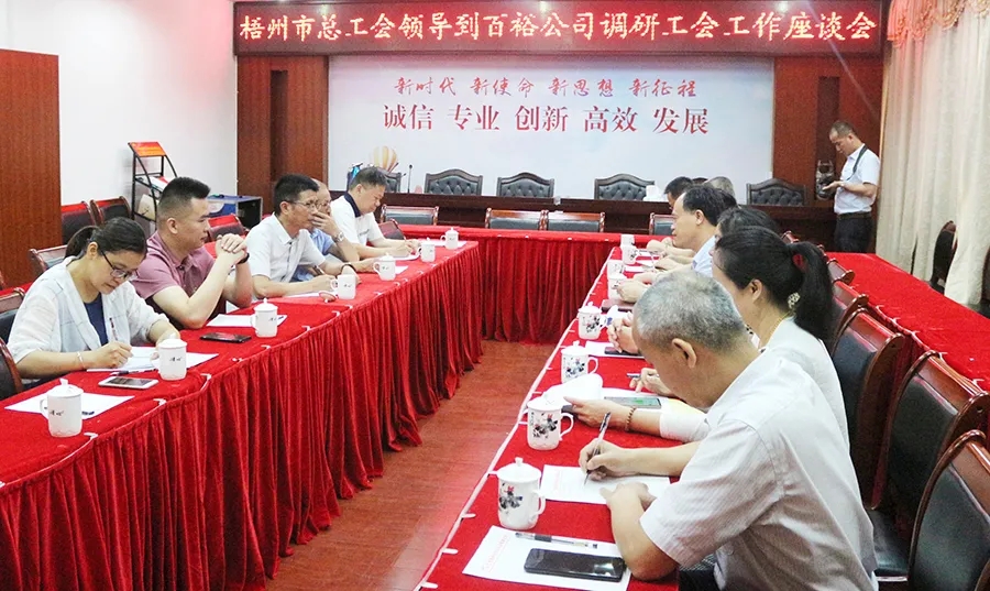 5月18日,梧州市總工會黨組書記、常務(wù)副主席謝善高、辦公室主任陳潔萍、勞經(jīng)部部長呂星等領(lǐng)導(dǎo)蒞臨百裕調(diào)研指導(dǎo),重點了解基層工會建設(shè)情況、運轉(zhuǎn)情況以及勞模創(chuàng)新工作等方面的工作情況。岑溪市人大副主任、工會主席謝梅、百裕世紀(jì)工會主席曾晏來陪同調(diào)研。