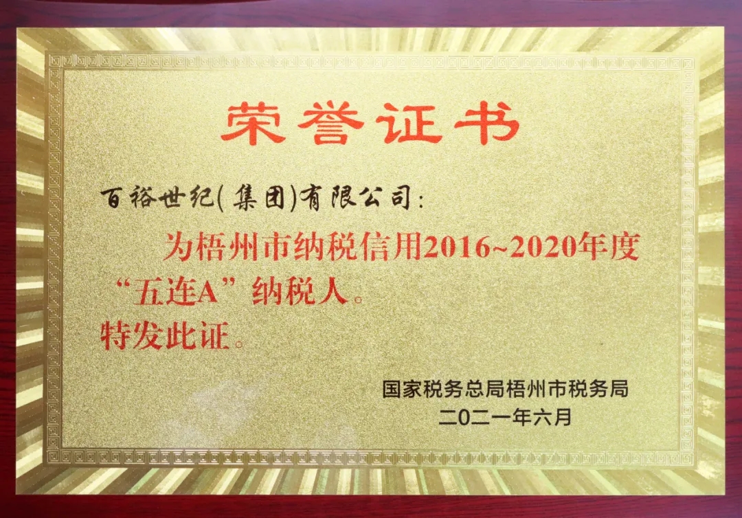 2021年6月,百裕世紀被國家稅務(wù)總局梧州市稅務(wù)局評定為梧州市納稅信用2016-2020年度“五連A”納稅人榮譽稱號,并頒發(fā)證書。