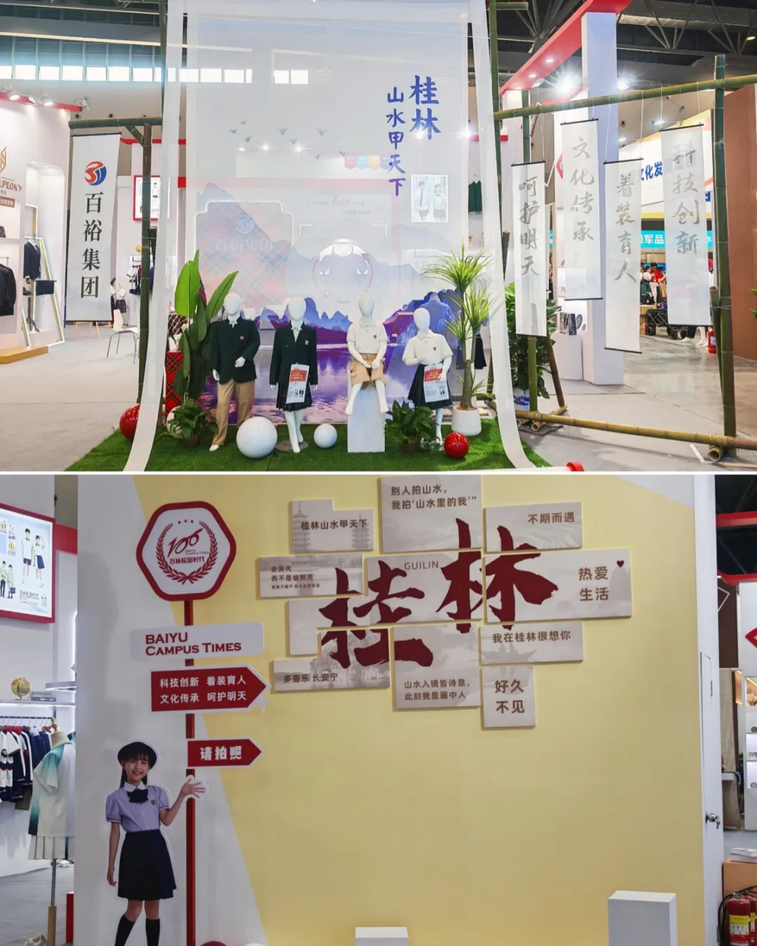 此次參展,百裕集團(tuán)巧妙融合桂林地域文化特色,將“水墨丹青”系列校服產(chǎn)品置于沉浸式的桂林山水場(chǎng)景之中:一幅徐徐展開(kāi)的靈動(dòng)畫(huà)卷,將清新雅致的校服與詩(shī)意山水交相輝映,生動(dòng)詮釋了校園服飾美學(xué)與地域文化傳承的完美結(jié)合,彰顯了百裕在校服設(shè)計(jì)領(lǐng)域的深厚功底與美學(xué)追求,展位還精心設(shè)計(jì)打卡區(qū),吸引了眾多參觀者駐足欣賞、拍照留念。