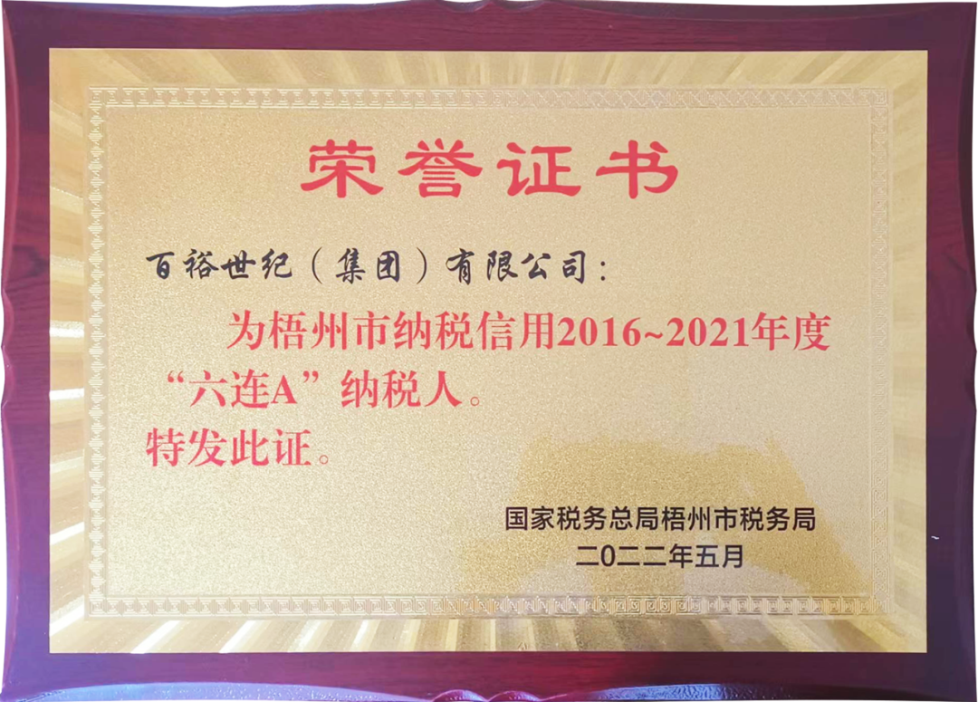 近日,經(jīng)國家稅務(wù)總局梧州市稅務(wù)局評審,百裕世紀(jì)(集團(tuán))有限公司被評為2016~2021年度“六連A”納稅人,這是我們堅持依法、誠信經(jīng)營的實質(zhì)成果。