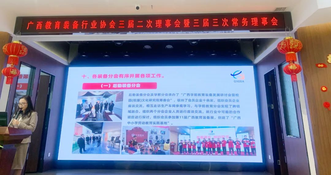 張珊會長對協(xié)會2022年工作情況進行了總結匯報。2022年協(xié)會密切關注國家大事,堅定不移與黨中央保持高度一致,組織協(xié)會會員企業(yè)集中學習黨的二十會議精神。在新冠疫情的大環(huán)境下,舉辦協(xié)會成立十周年慶典活動,成功舉辦第11屆廣西教育裝備展示會,成立協(xié)會專家組,與廣西標準化協(xié)會簽訂發(fā)展戰(zhàn)略合作協(xié)議,同時積極吸收優(yōu)質會員企業(yè),開展各種研討培訓、展示交流、參觀考察、公益捐贈等活動,在會員的共同努力下,向行業(yè)向企業(yè)交出了一份滿意的答卷。