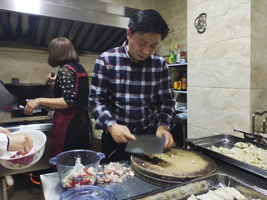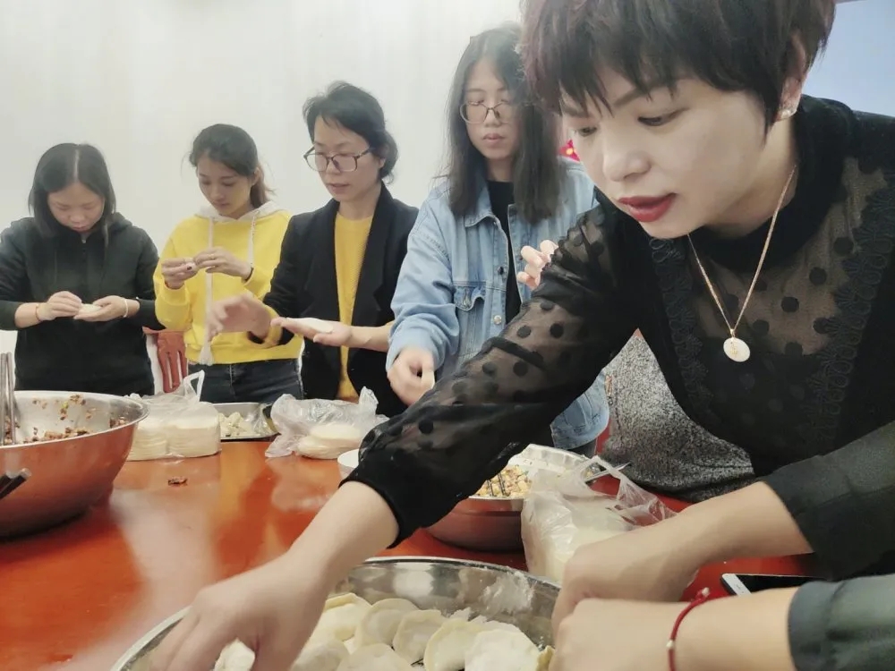 大家齊聚一堂相互交流經驗學習,和面、搟皮、拌餡.....分工明細,不一會兒,一盤盤整齊飽滿的餃子就出來了。