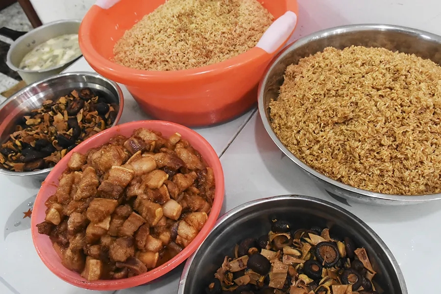 后勤部精心為大家準(zhǔn)備了豐富的食材五花肉、雞蛋、香菇、魷魚(yú)、海蠣、綠豆,并根據(jù)員工喜好調(diào)配好兩種不同口味餡料。