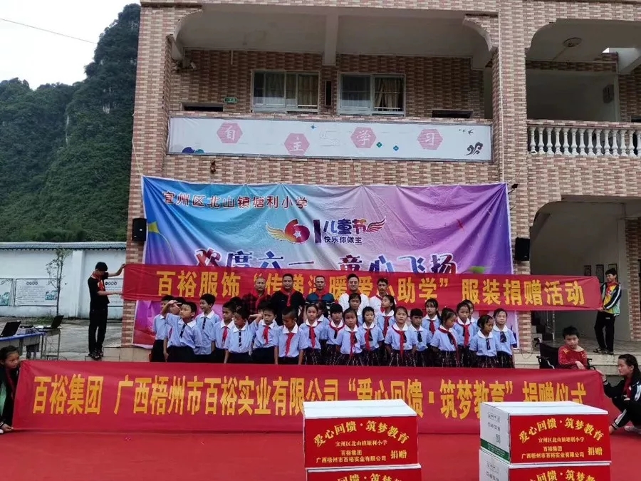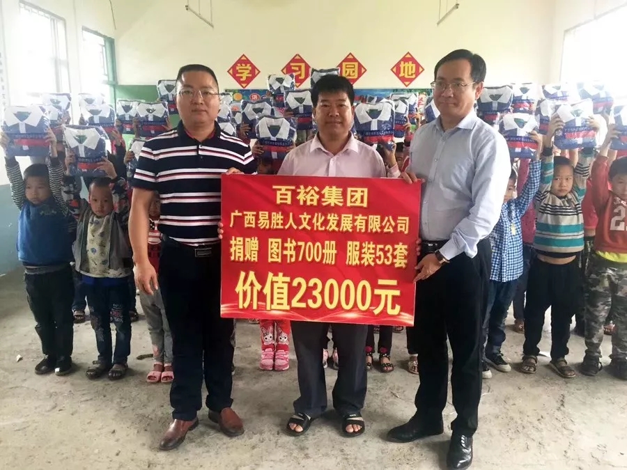 百裕集團服務(wù)河池地區(qū)已有6年多,多年來開展了一系列的捐贈助學(xué)的公益活動。時值六一兒童節(jié),百裕集團不忘初心,兌現(xiàn)“為環(huán)江村屯學(xué)校捐贈1106套愛心校服”承諾,并增加圖書等物資捐贈,在總經(jīng)理林志煌的帶領(lǐng)下,先后走進環(huán)江縣10個鄉(xiāng)14個村級小學(xué),惠及1106名小朋友,為孩子們送上節(jié)日的祝福。